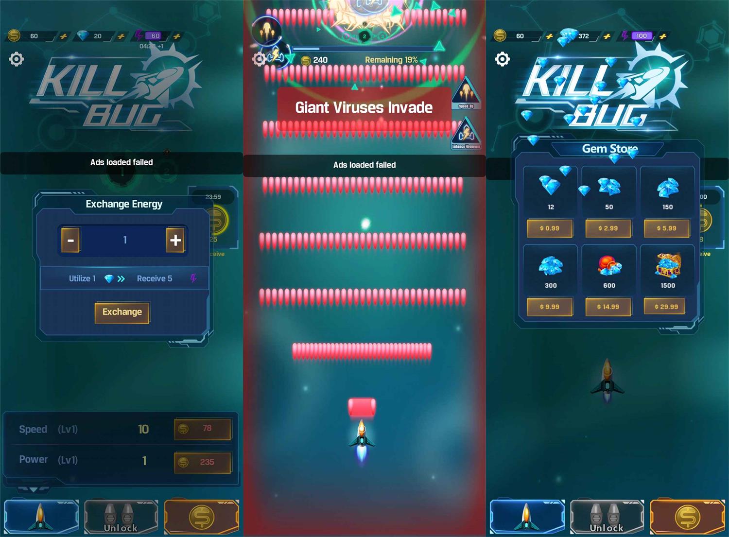 BUG终结者是一款休闲娱乐闯关游戏。经典的游戏界面,控制你的战机消灭所有来袭病毒,开启狂暴模式,灭掉所有病毒,已解锁内购。